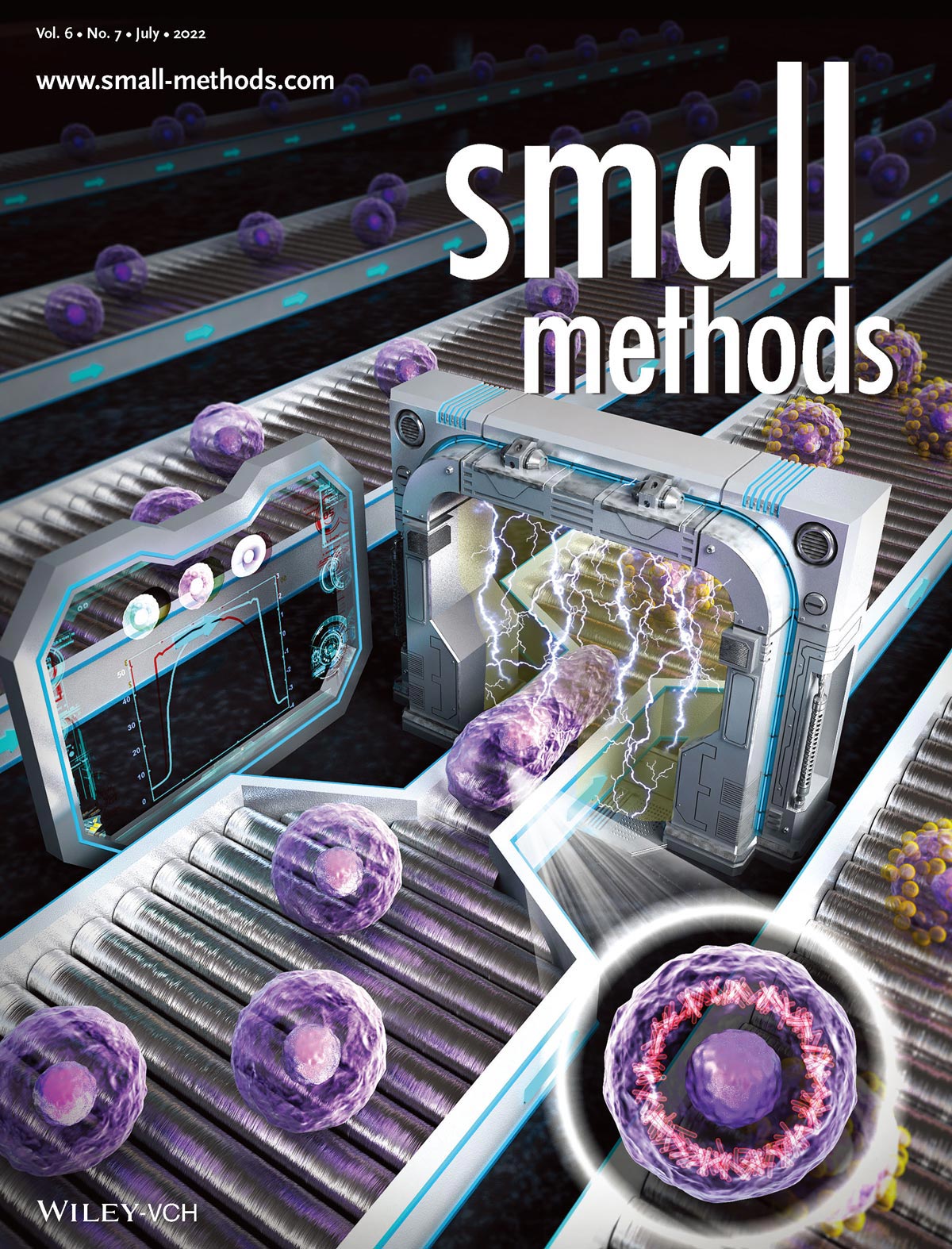 В статье № 2200325 под руководством Вана и его коллег представлена бескамерная проточная цитометрия для измерения внутренних механических свойств клеток (CFIMC), предназначенная для высокопроизводительной характеризации механических свойств одиночных клеток. Стратегия CFIMC основана на пространственном сопряжении иммитансных электродов с сужающимся каналом, благодаря чему иммитансные сигналы содержат информацию о динамической деформации клетки при её прохождении через сужающийся канал.